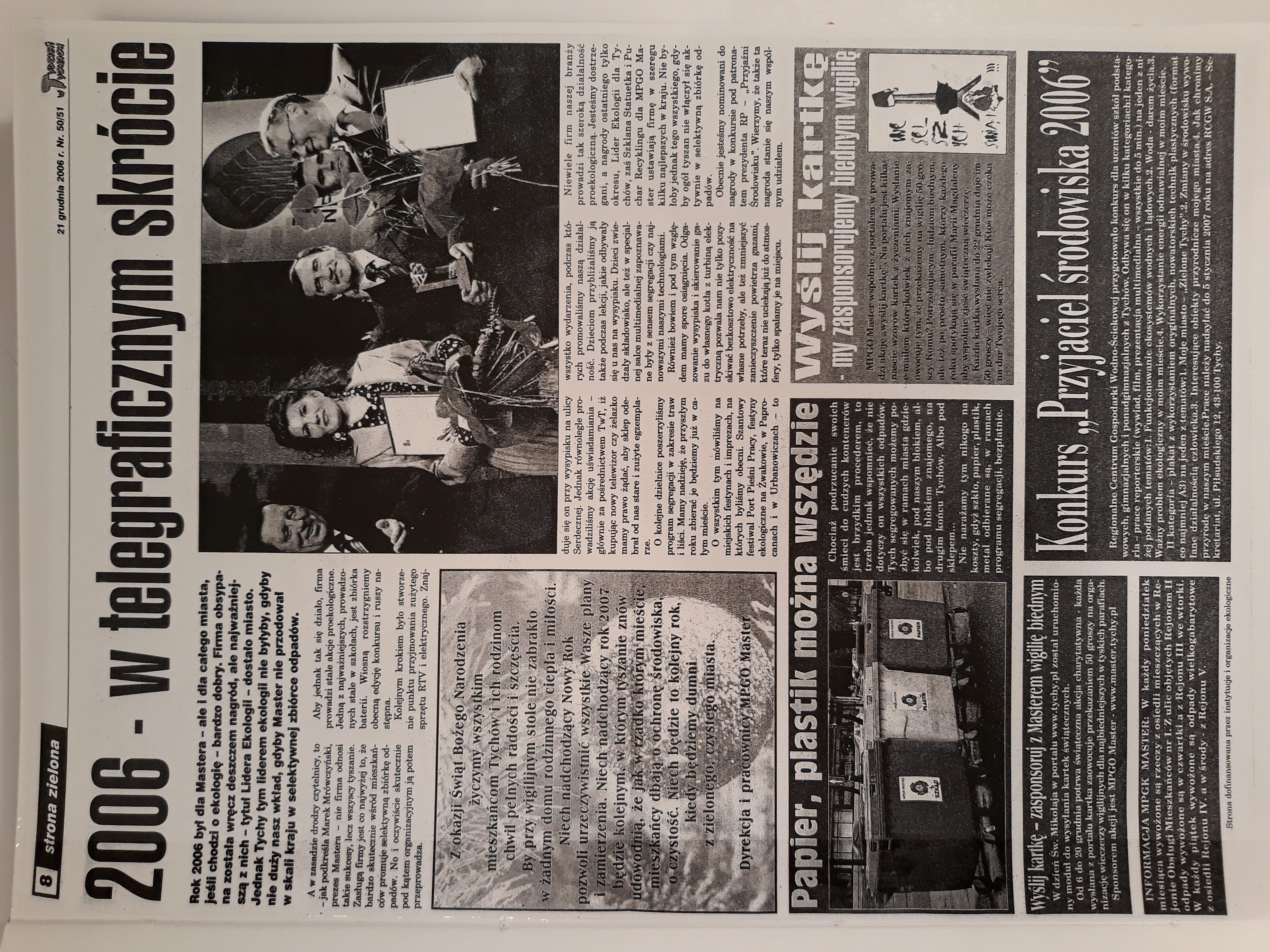 Rok 2006 był dla “Mastera” – ale i dla całego miasta, jeśli chodzi o ekologię – bardzo dobry. Firma obsypana została wręcz deszczem nagród, ale najważniejszą z nich – tytuł Lidera Ekologii – dostało miasto. Jednak Tychy tym liderem ekologi nie byłyby, gdyby nie duży nasz wkład, gdyby “Master” nie przodował w skali kraju w selektywnej zbiórce odpadów…