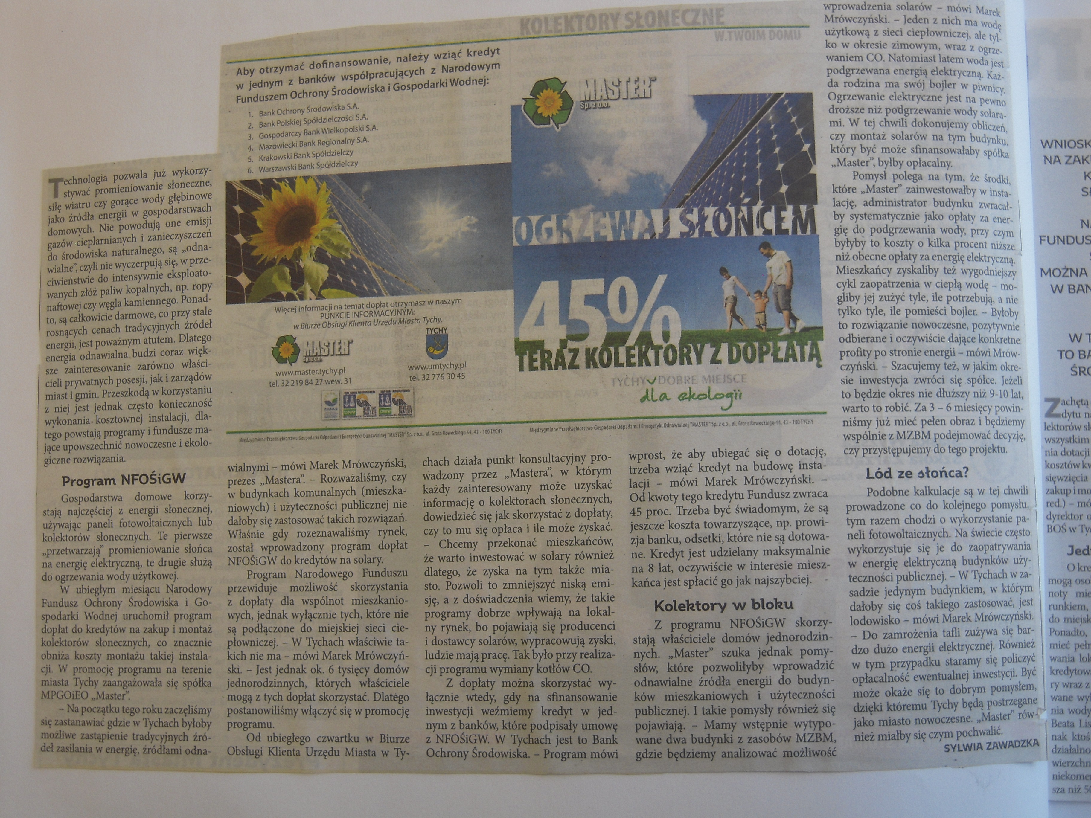 Mieszkańcy Tychów mogą już korzystać z dopłat do kredytów na zakup i montaż kolektorów słonecznych – ruszył program Narodowego Funduszu Ochrony Środowiska i Gospodarki Wodnej, który dodatkowo w Tychach promuje MPGOiEO “Master”. Spółka ma też własne pomysły wdrożenie na terenie miasta nowoczesnych rozwiązań w zakresie energii odnawialnej…