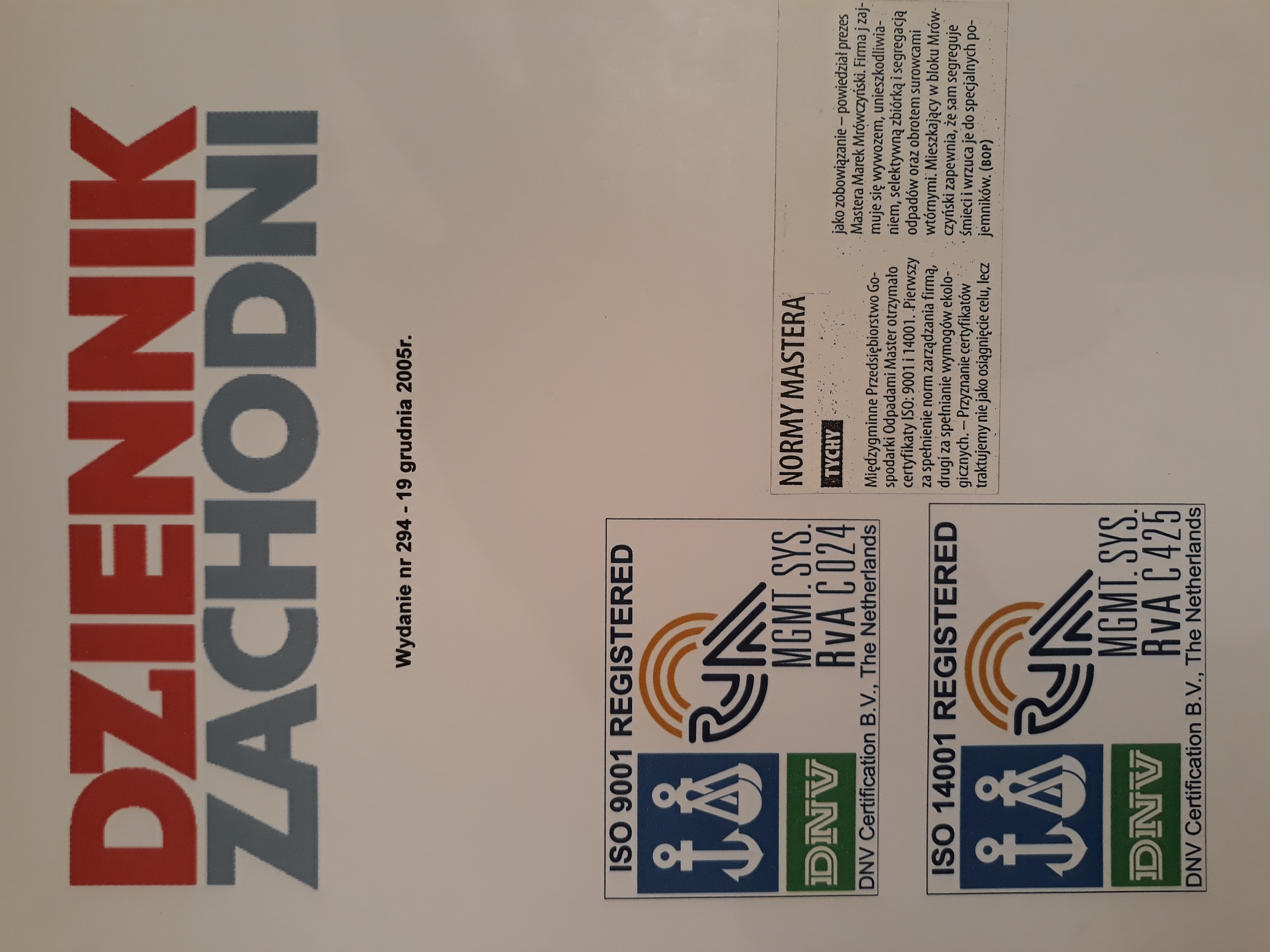 Międzygminne Przedsiębiorstwo Gospodarki Odpadami “Master” otrzymało certyfikaty ISO:9001 i 14001…