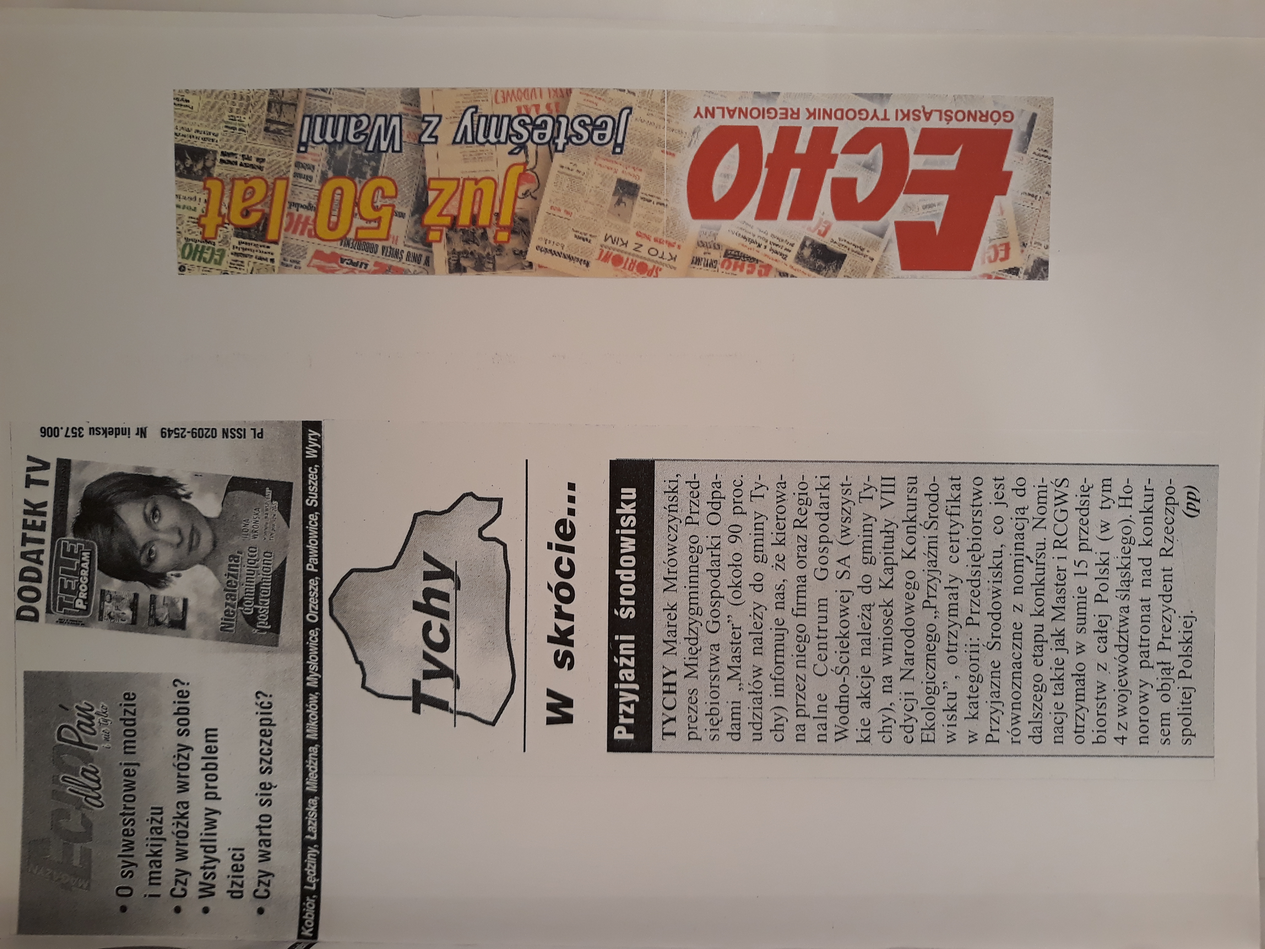 Marek Mrówczyński prezes Międzygminnego Przedsiębiorstwa Gospodarki Odpadami “Master” informuje nas, że kierowania przez niego firma oraz Regionalne Centrum Gospodarki Wodno-Ściekowej na wniosek Kapituły VIII edycji Narodowego Konkursu Ekologicznego “Przyjaźni Środowisku”, otrzymały certyfikat w kategorii: Przedsiębiorstwo Przyjazne Środowisku, co jest równoznaczne z nominacją do dalszego etapu konkursu…