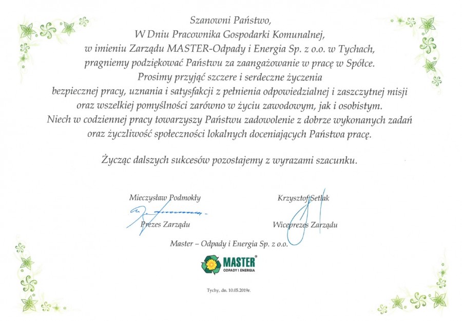 w imieniu Zarządu MASTER-Odpady i Energia Sp. z o.o. w Tychach,