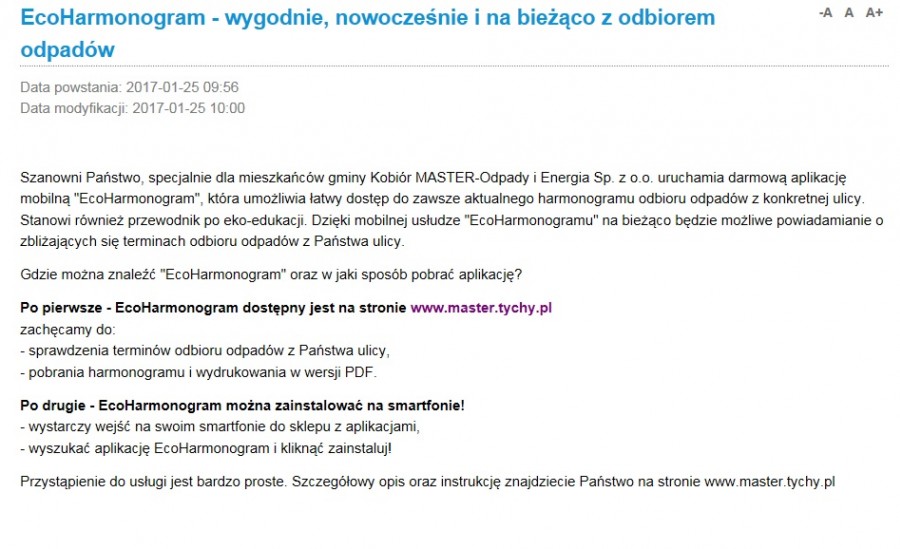 EcoHarmonogram - informacja na stronie gminy Kobiór