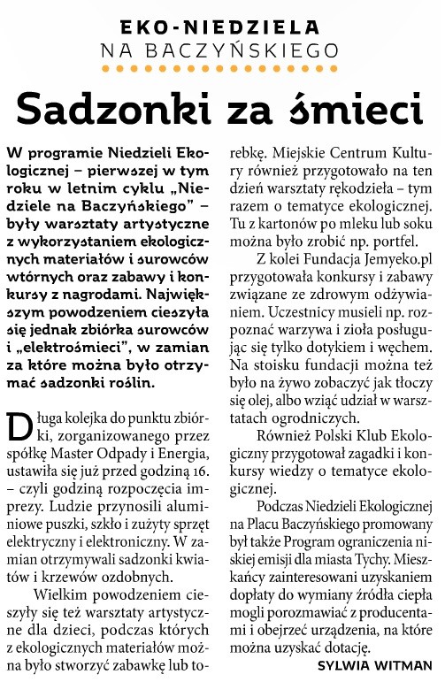 W wydaniu Tygodnika Twoje Tychy nr 27/450 z dnia 05.07.2016r. zostało zamieszczone podsumowanie EKOLOGICZNEJ NIEDZIELI NA BACZYŃSKIEGO, podczas której MASTER-Odpady i Energia Sp. z o.o. zorganizowało akcję odbioru surowców w zamian za sadzonki roślin ozdobnych.