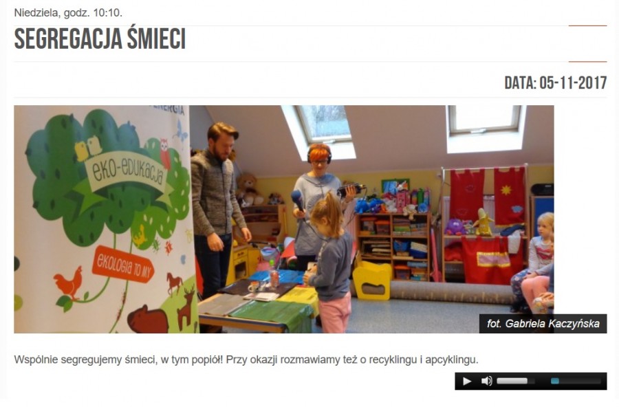 W dniu 24.10.2017r. o godz. 9:00 w Gminnym Przedszkolu w Kobiórze zostały zrealizowane pierwsze w tym sezonie grzewczym warsztaty z zakresu edukacji ekologicznej dot. segregacji popiołu, jak również nagranie do audycji Ekoranek (Radio Katowice), którego emisja miała miejsce 05.11.2017r. w niedzielę.