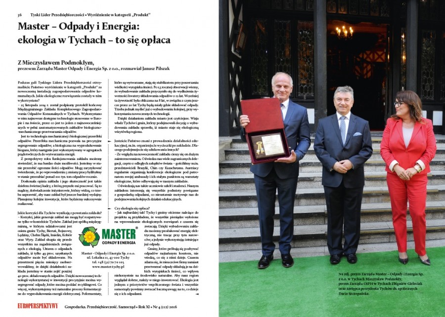 W wydaniu nr 4.112.2016 miesięcznika EUROPERSPEKTYWY ukazał się obszerny wywiad z Prezesem Mieczysławem Podmokłym pt." Ekologia w Tychach - to się opłaca". Artykuł nawiązuje do otrzymanego przez MASTER-Odpady i Energia Sp. z o.o. wyróżnienia w kategorii "Produkt" za nowoczesną instalację zagospodarowania odpadów komunalnych, wręczanego podczas Gali Tyskiego Lidera Przedsiębiorczości dn. 17.06.2016r.