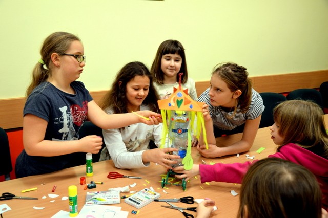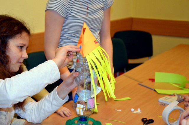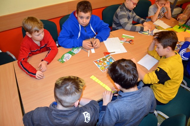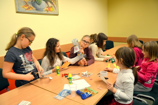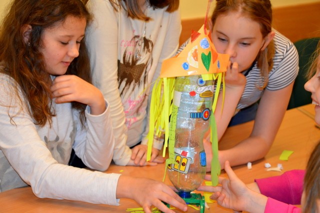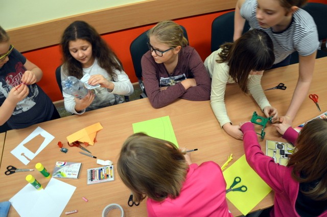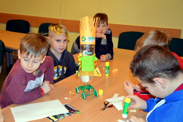 Podczas zajęć młodzież pracowała nad stworzeniem robotów z surowców recyklingowych.