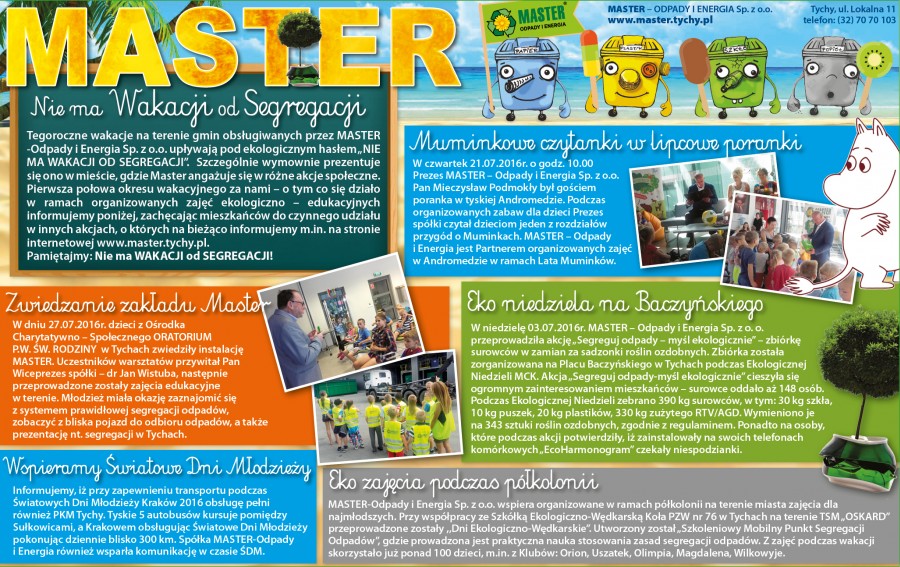 W wydaniu Tygodnika Twoje Tychy nr 31/454 z dnia 02.08.2016r. ukazał się artykuł pn. "Nie ma wakacji od segregacji", w którym MASTER-Odpady i Energia Sp. z o.o. informuje o akcjach ekologicznych organizowanych podczas wakacji w mieście.