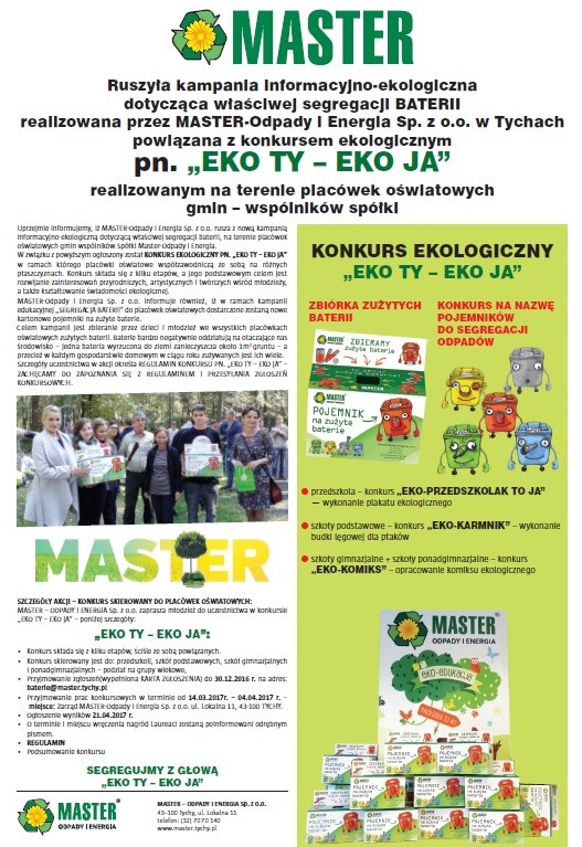 Na łamach Zielonych Stron Gazety Wyborczej, w dniu 16.12.2016r. ukazał się artykuł dotyczący kampanii informacyjno-ekologicznej realizowanej przez Master-Odpady i Energia Sp. z o.o. w Tychach.