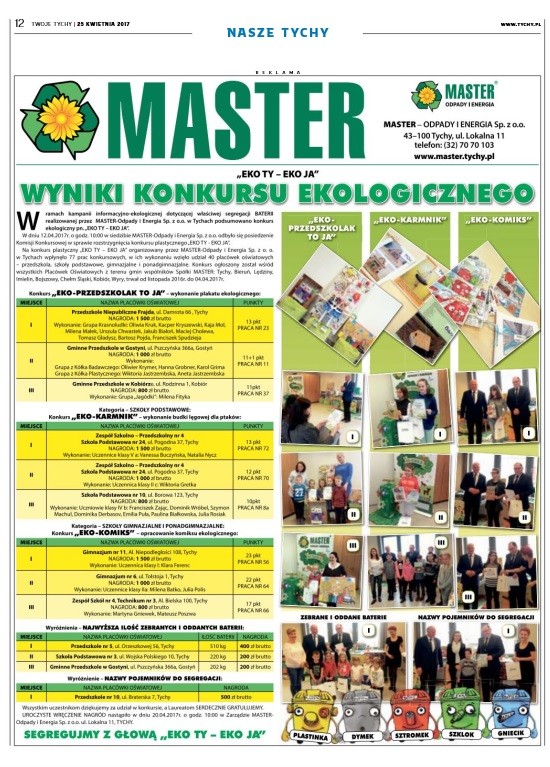 W wydaniu Tygodnika "Twoje Tychy" nr 492 z dnia 25.04.2017r. ukazała się obszerna relacja z podsumowania konkursu ekologicznego pt. "Eko Ty - Eko Ja" zorganizowanego na terenie placówek oświatowych.