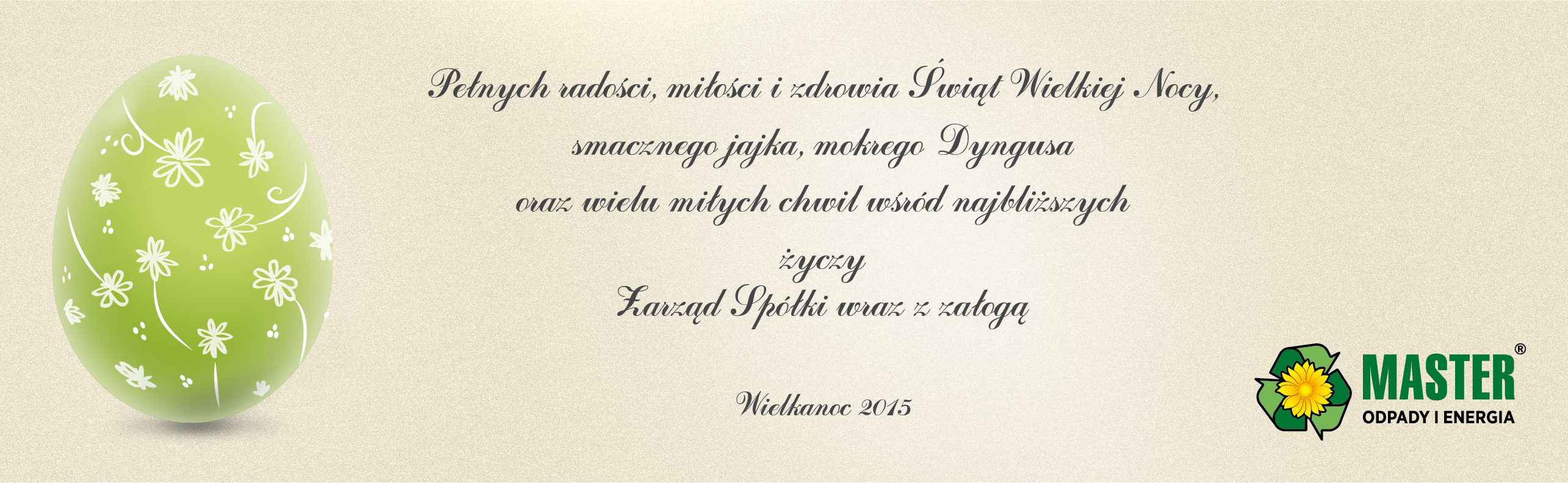 ŻYCZENIA ŚWIĄTECZNE 31.03.2015 Pełnych radości, miłości i zdrowia Świąt Wielkiej Nocy, smacznego jajka, mokrego Dyngusa oraz wielu miłych chwil wśród najbliższych życzy Zarząd Spółki MASTER - ODPADY I ENERGIA wraz z załogą ŻYCZENIA WIELKANOCNE